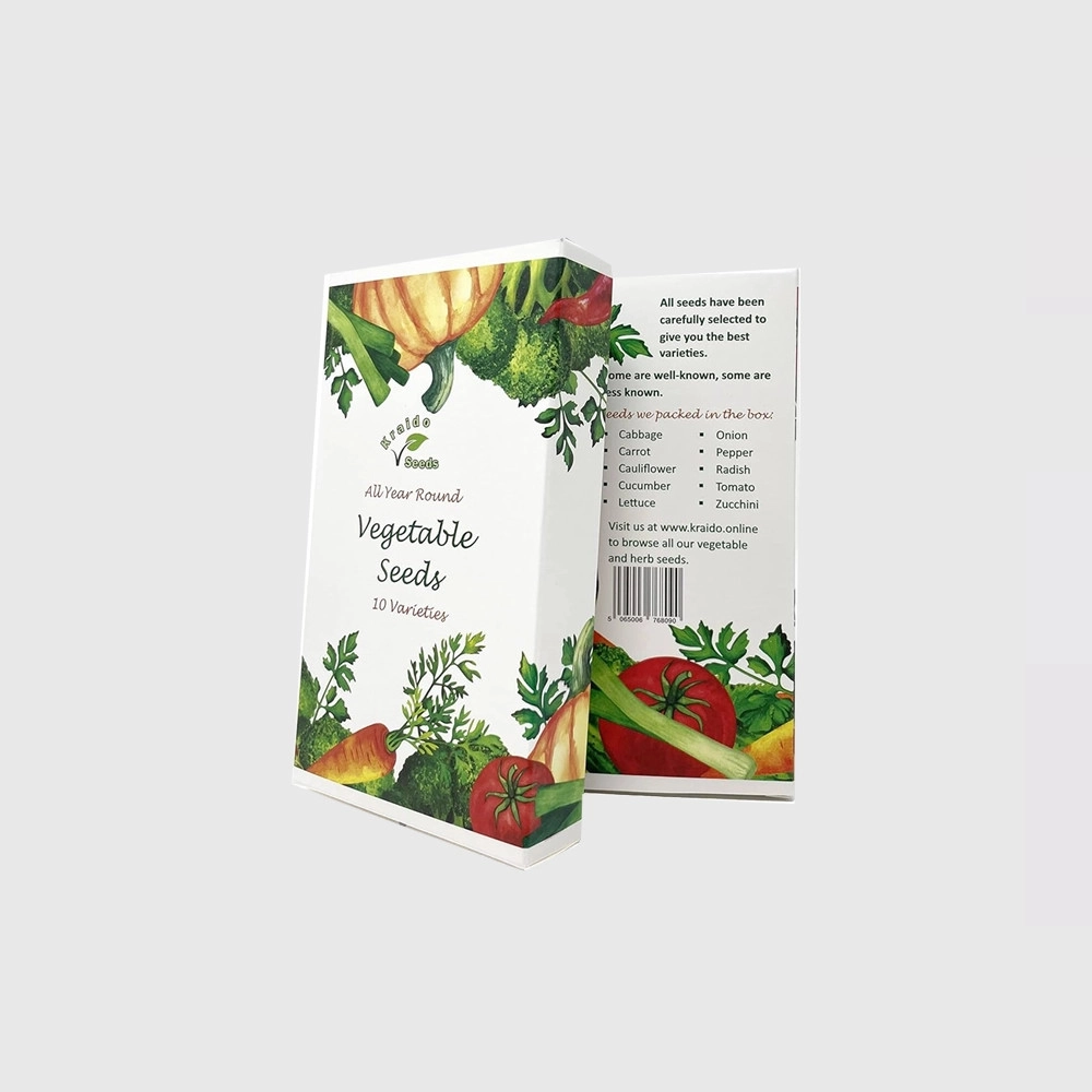In addition to standard features like partitions and windows, you may also obtain specialized packaging boxes for vegetable seeds. We give you high-quality printing options and appealing packaging designs to make your box stand out even more. In this way, your vegetable seeds stand out in a crowded marketplace and look better when displayed on store shelves.